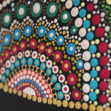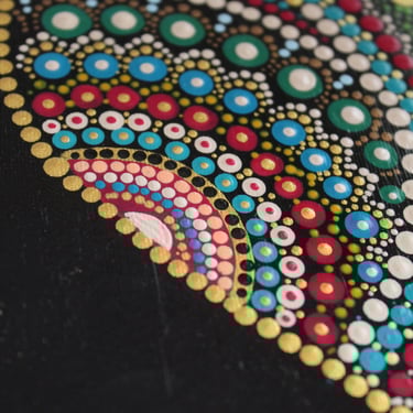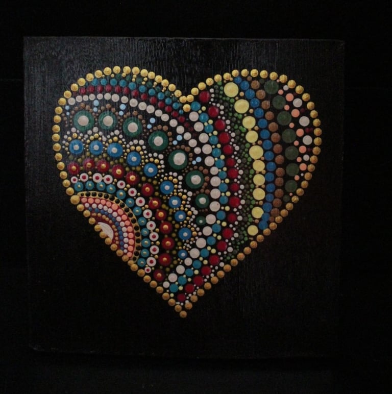 Each carefully placed acrylic dot builds into flowing waves of color ; from warm reds and golds to calming blues and greens, forming a luminous heart that radiates movement and depth. The black canvas serves as a grounding space, allowing the vibrant patterns to shine with intensity, like light emerging from the dark. Measuring 15× 15 cm, this piece balances intimacy and presence, making it a striking yet versatile work for any collection. It embodies both precision and emotion, offering viewers a sense of connection, rhythm, and joy.
